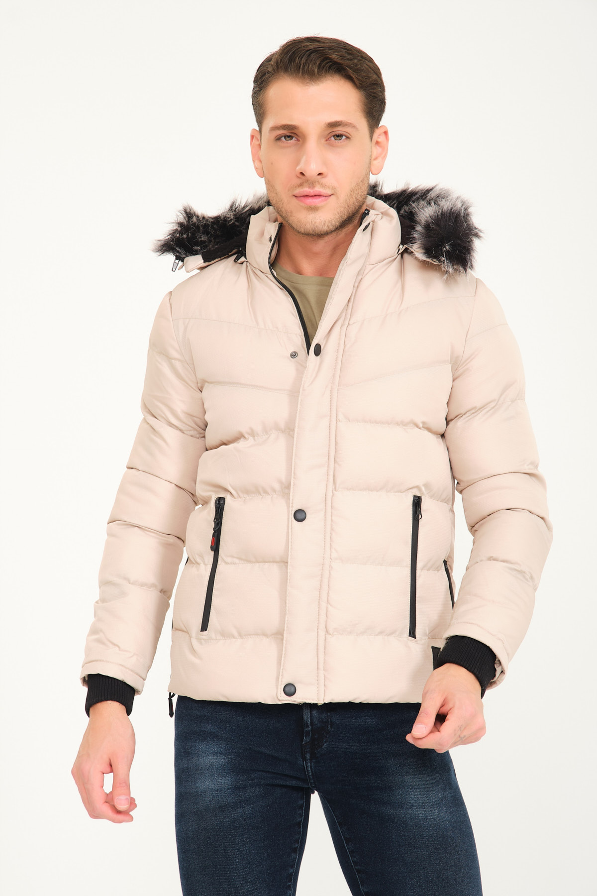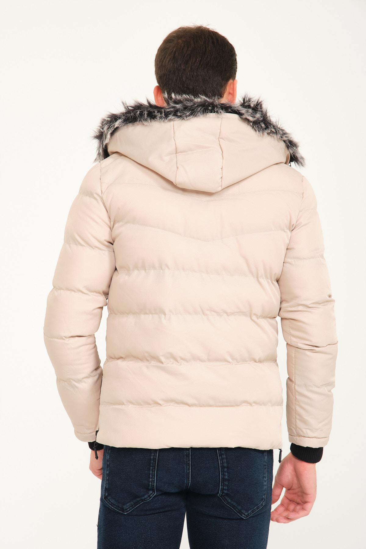 Erkek Şişme Beyaz Slim Fit Soğuk Geçirmez Kürklü Casual Mont